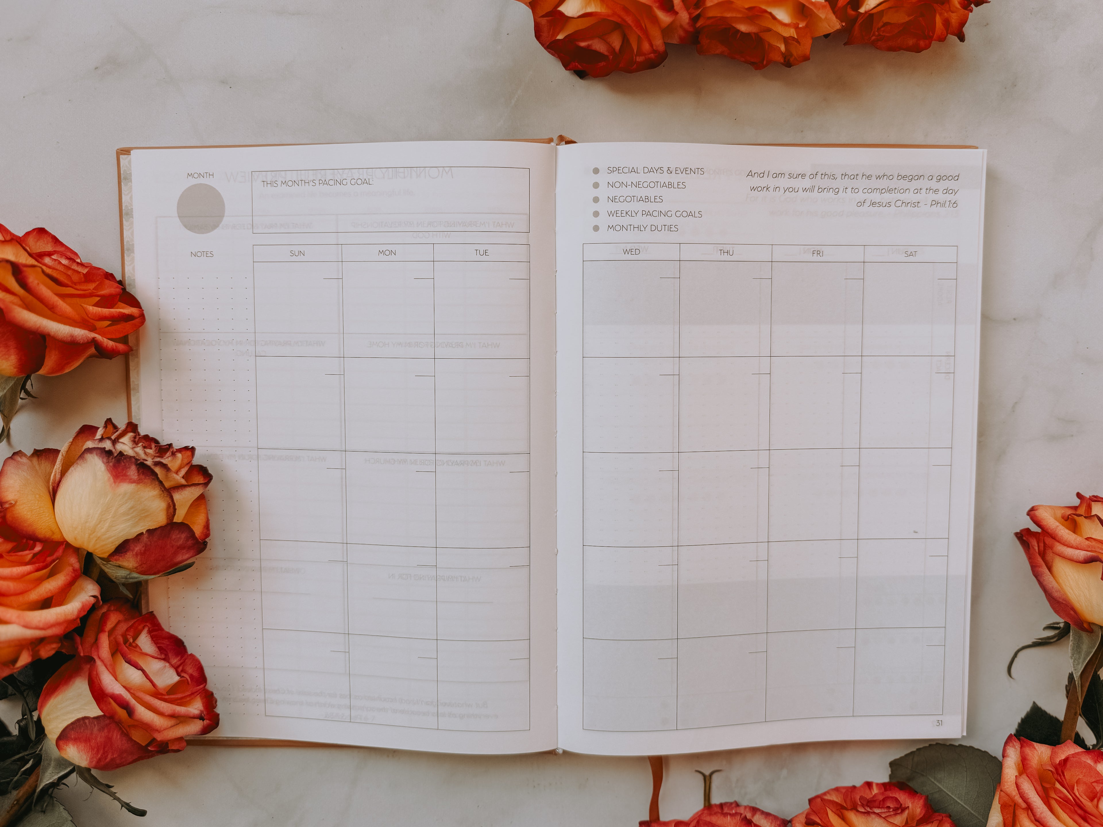 This planner will help you think, dream and pray over every part of your life -- from the big overarching life goals, to the daily, hourly nitty-gritty details. I've never seen a planner do that! It is beautifully designed and very the paper is buttery soft.